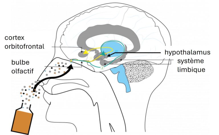 Sans contre-indication majeure, le simple fait de respirer certaines senteurs active des zones de notre cerveau liées au subconscient. Ces molécules odorantes offertes par la nature atteignent la muqueuse olfactive de notre cavité nasale, où elles sont reconnues par des récepteurs sensoriels et transformées en influx nerveux acheminés par le nerf olfactif jusqu’au bulbe olfactif. Ce dernier les traite et les transmet plus loin dans le cerveau :